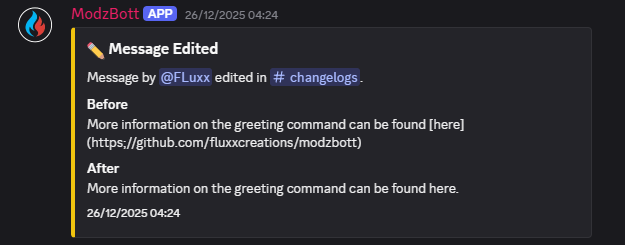 Shows that a message has been edited, who edited the message, which channel the message is in, what the message use to say, what the message says now and provides a timestamp.